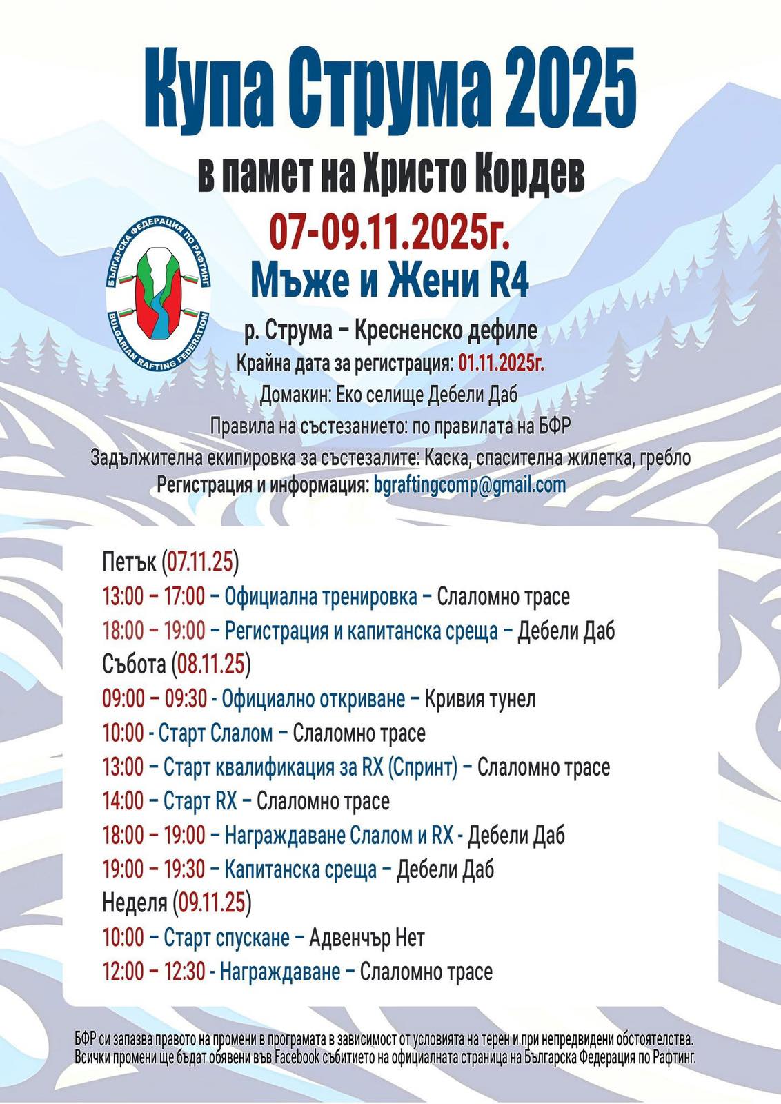 До края на деня (31 октомври 2025 г.) всички любители на рафтинга могат да подадат своята заявка за участие в традиционното есенно състезание Купа Струма 2025, което тази година ще се проведе в памет на Христо Кордев от Симитли – човек, оставил ярка следа със своя спортен дух, приятелство и любов към реката.