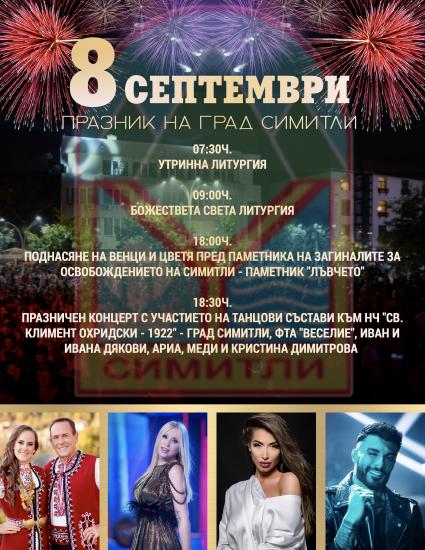 Една седмица ни дели от едно от най – дълго чаканите събития в Симитли, а именно празника на нашия град. На 8-ми септември за поредна година ще се съберем заедно, за да отбележим този специален ден. Ден, в който и Православната църква празнува Рождество Богородично, а както всички знаем – Богородица е закрилница на Симитли.