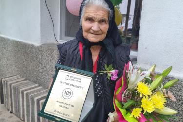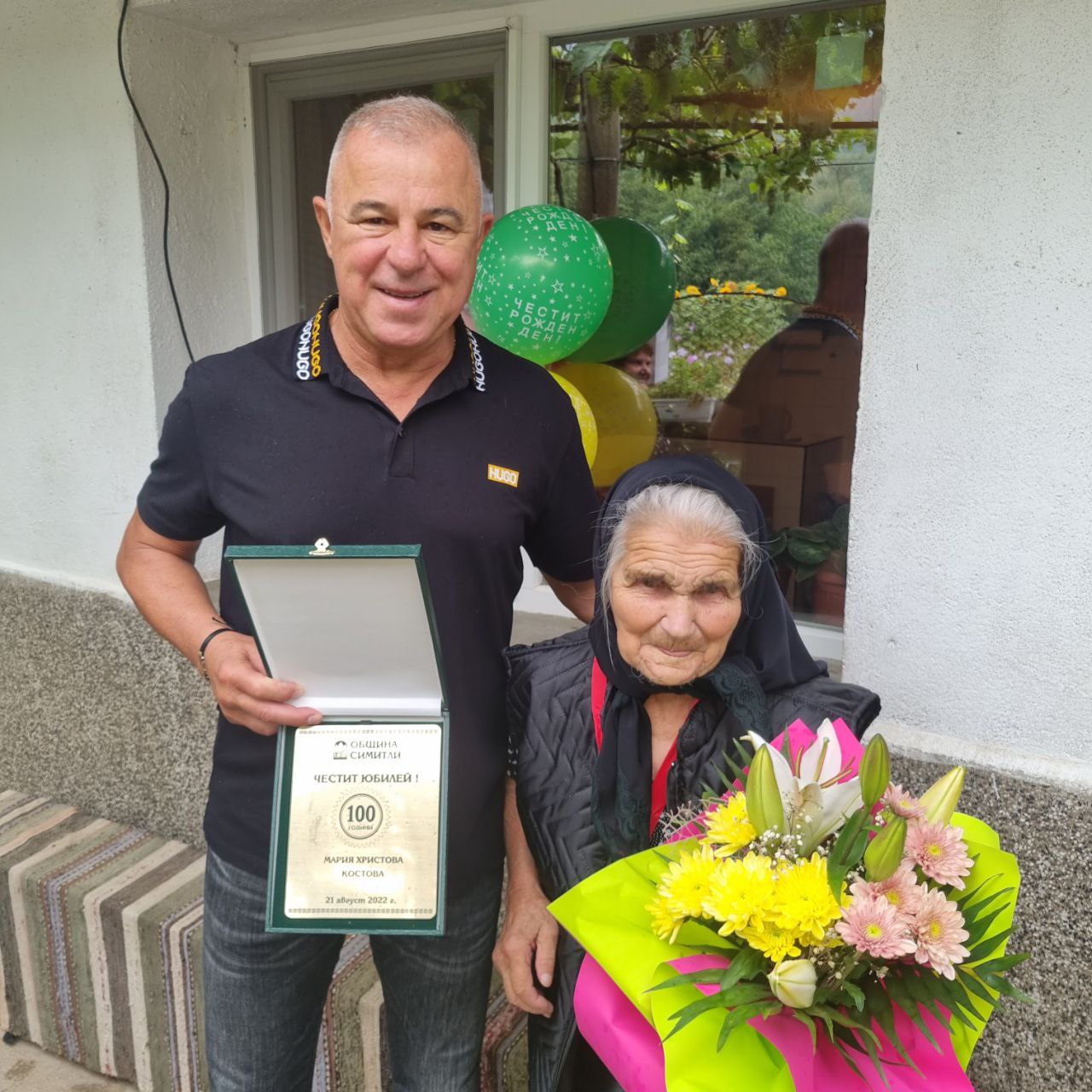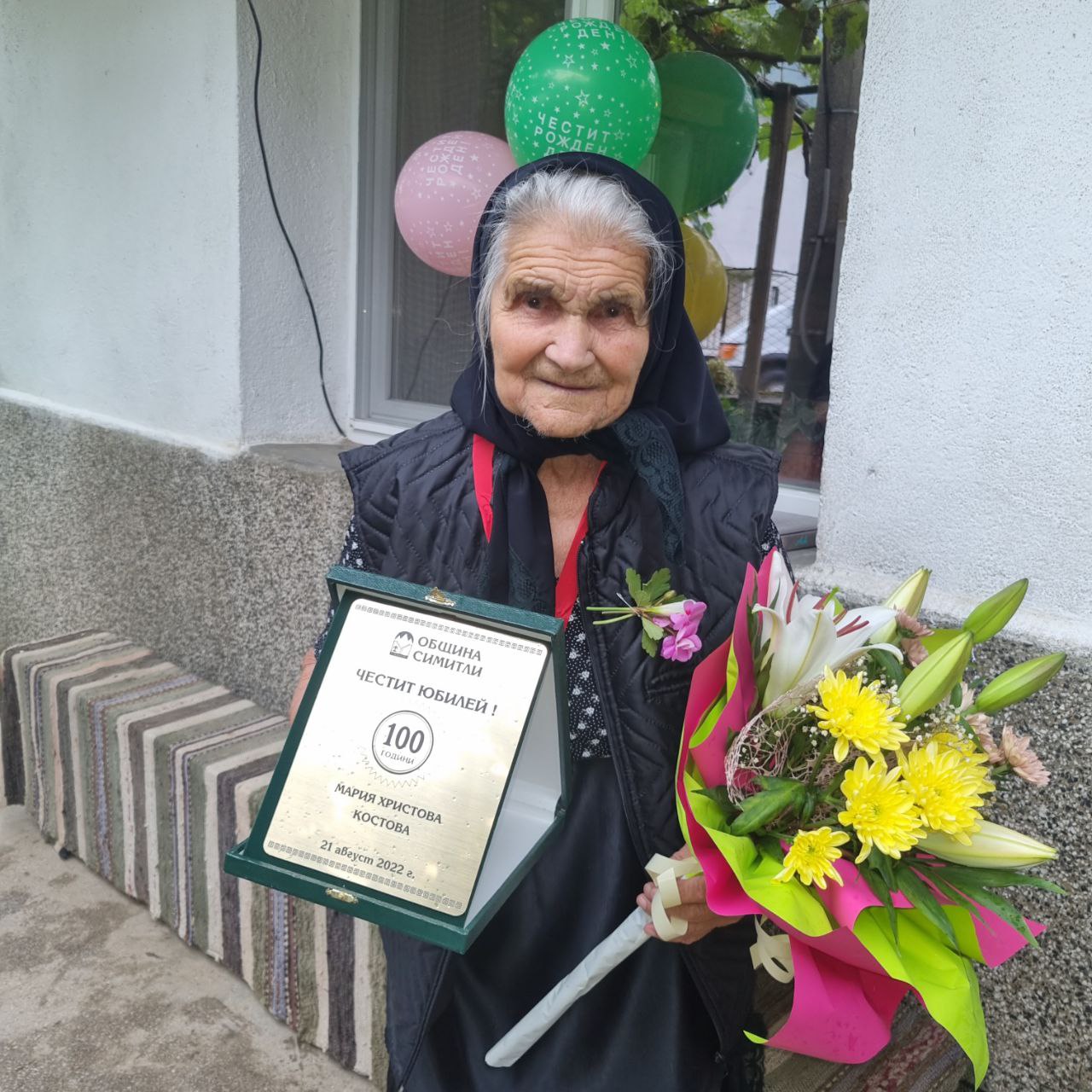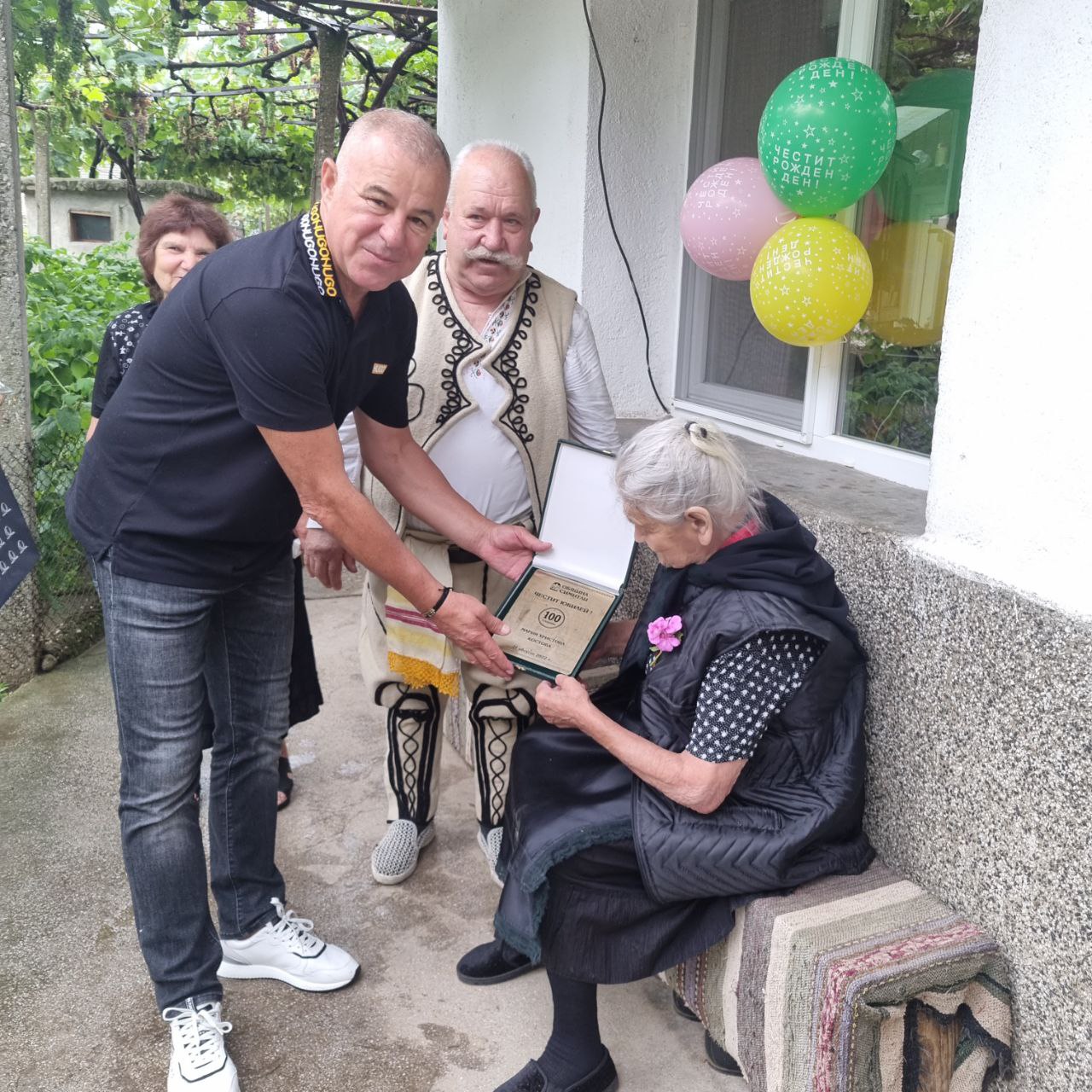 Столетницата бе изненадана в дома си от кмета на Община Симитли Апостол Апостолов, председателят на Общински съвет - Симитли Вилимир Александров и кметицата на село Железница Гергана Гиздова, които ѝ връчиха плакет и красив букет цветя.