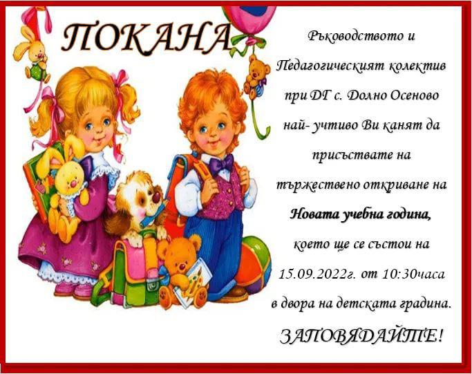 С богата и много разнообразна програма ще поставят началото на новата учебна година в Детска градина – Долно Осеново. Специалното събитие, посветено на най – малките жители на селото ще започне в 10.30 часа на 15-ти септември в двора на детската градина.