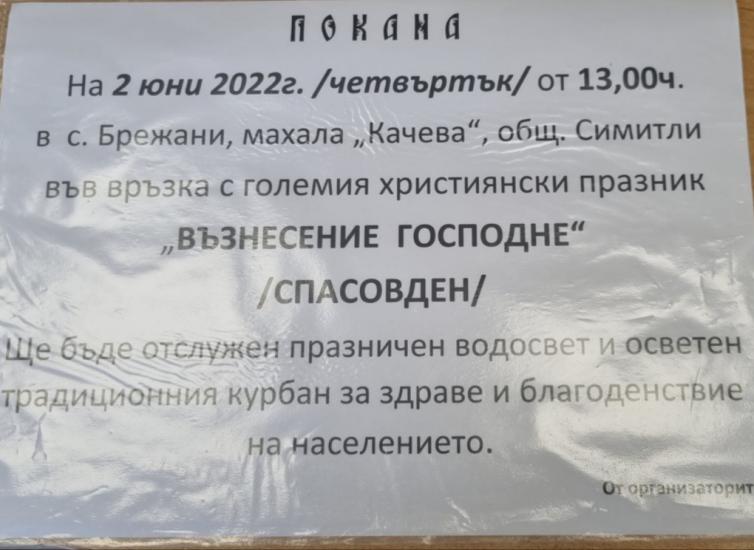 На 2-ри юни от 13.00 часа в село Брежани, махала "Качева", общ. Симитли, във връзка с големия християнски празник Възнесение Господне (Спасовден) ще бъде отслужен празничен водосвет и осветен традиционния курбан за здраве и благоденствие, съобщават организаторите.