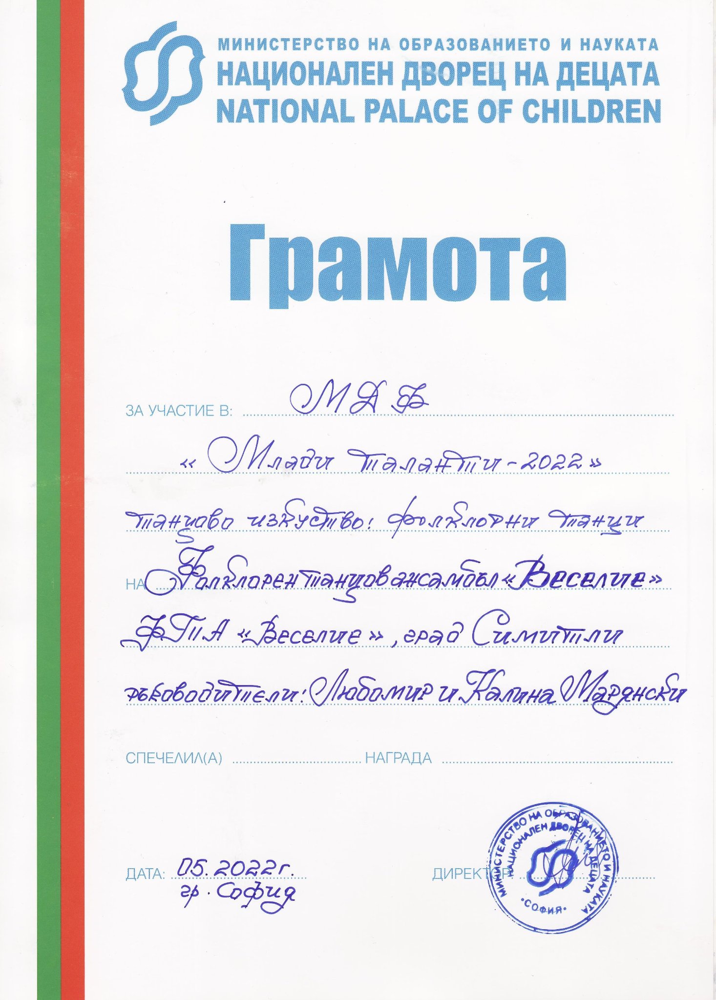 Децата ни си тръгнаха от София с много положителни емоции, поредно признание за техния талант и таланта на техните ръководители Калина и Любомир Марянски, както и с грамота и статуетка.