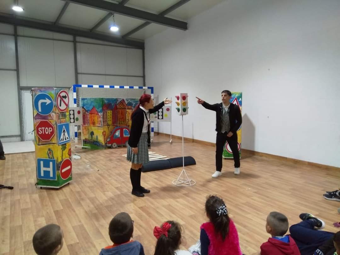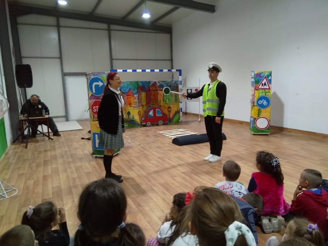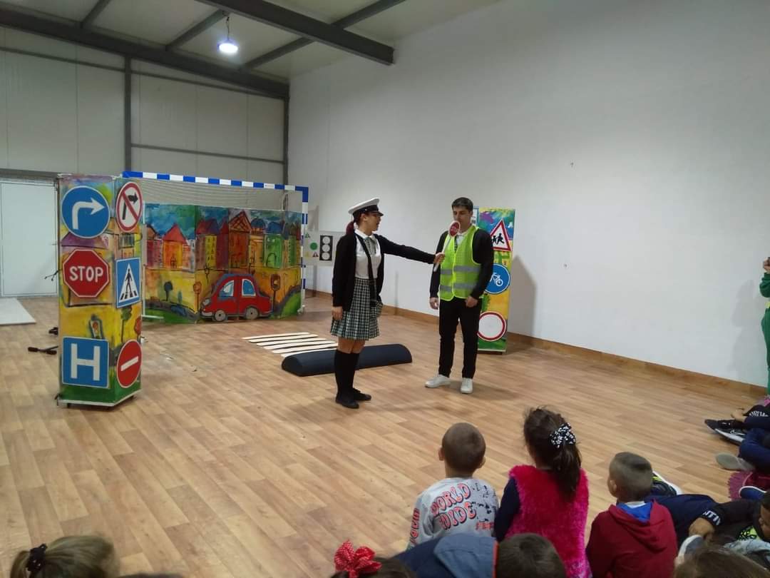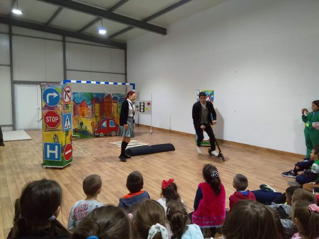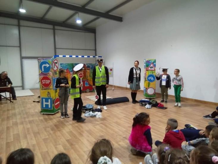 В петъчния ден театралното представление гостува в учебното заведение. Под формата на забавни игри, танци и песни, Пепи и Глупи, в чиито роли влязоха Пепа Манева и Аладин Алиибрахим разказаха на малчуганите защо е важно да спазват правилата за движение.