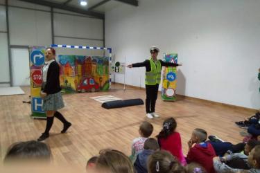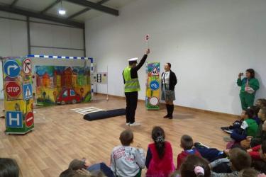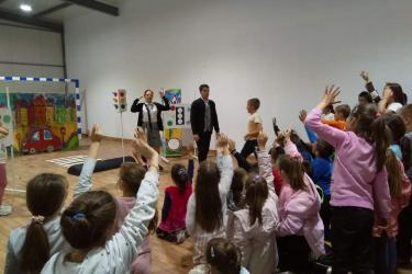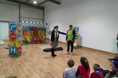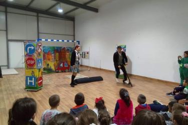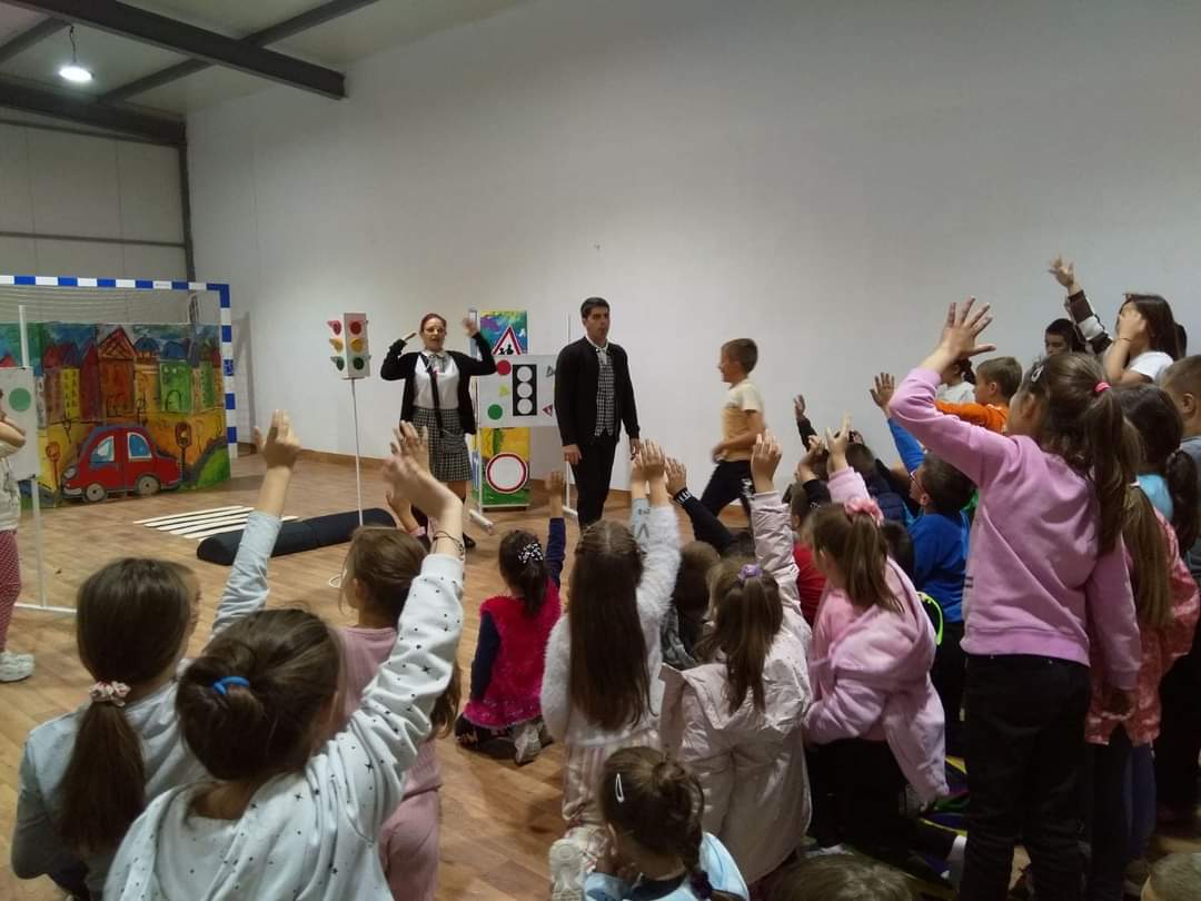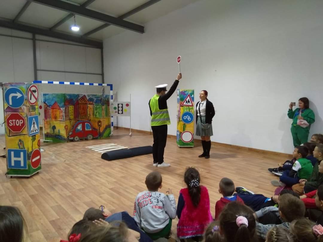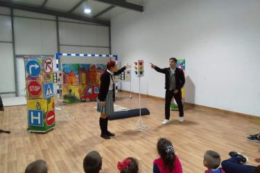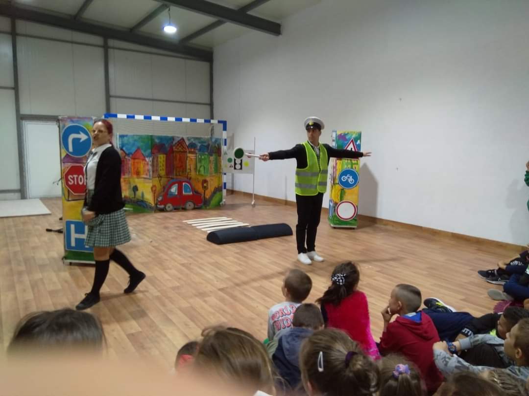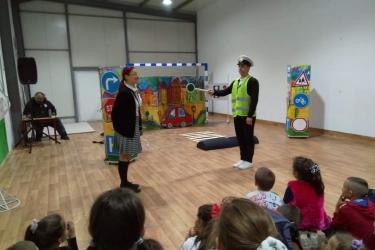 В петъчния ден театралното представление гостува в учебното заведение. Под формата на забавни игри, танци и песни, Пепи и Глупи, в чиито роли влязоха Пепа Манева и Аладин Алиибрахим разказаха на малчуганите защо е важно да спазват правилата за движение.