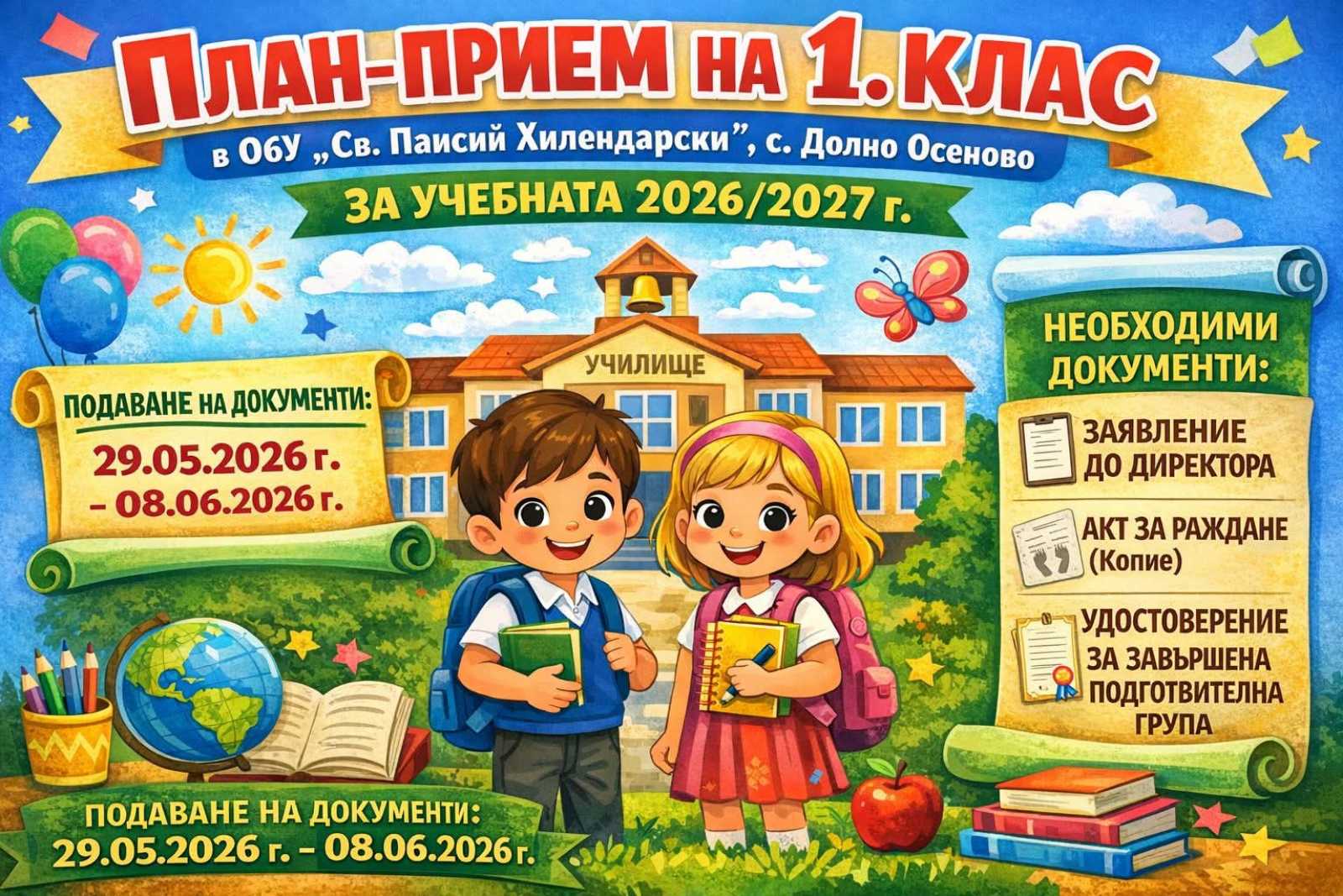ОбУ „Св. Паисий Хилендарски“ – с. Долно Осеново обявява прием на ученици в 1. клас за учебната 2026/2027 година.