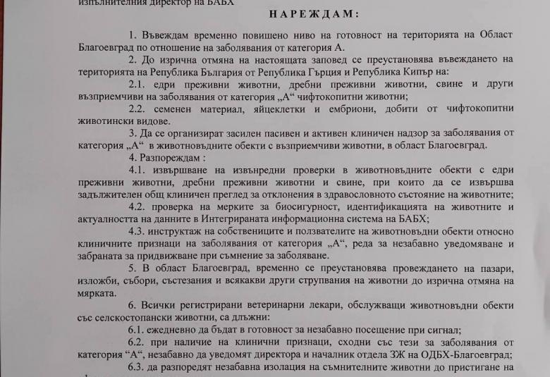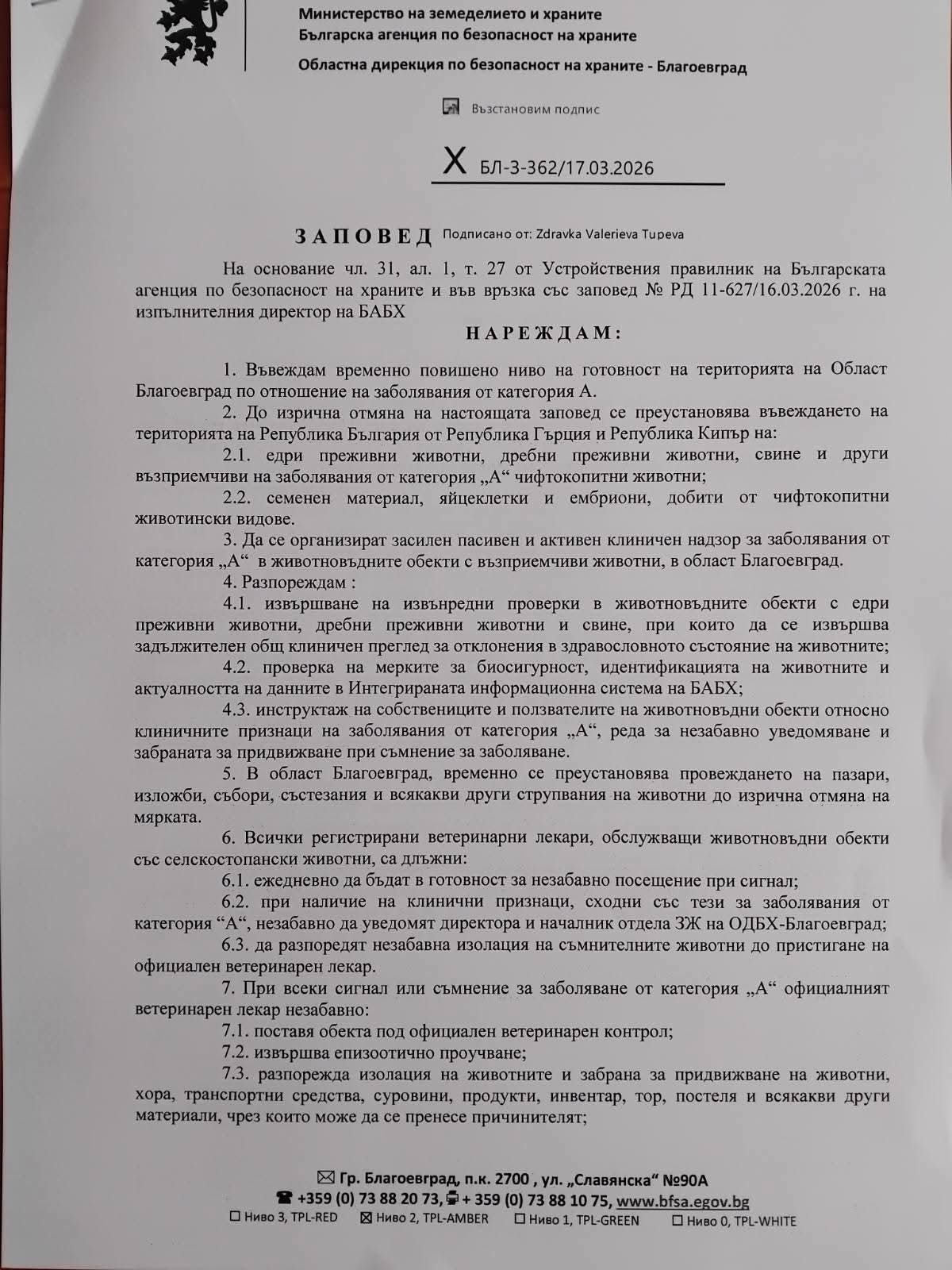 Отмяната е в изпълнение на заповед № РД11-627/16.03.2026 г. на изпълнителния директор на Българската агенция по безопасност на храните (БАБХ).
