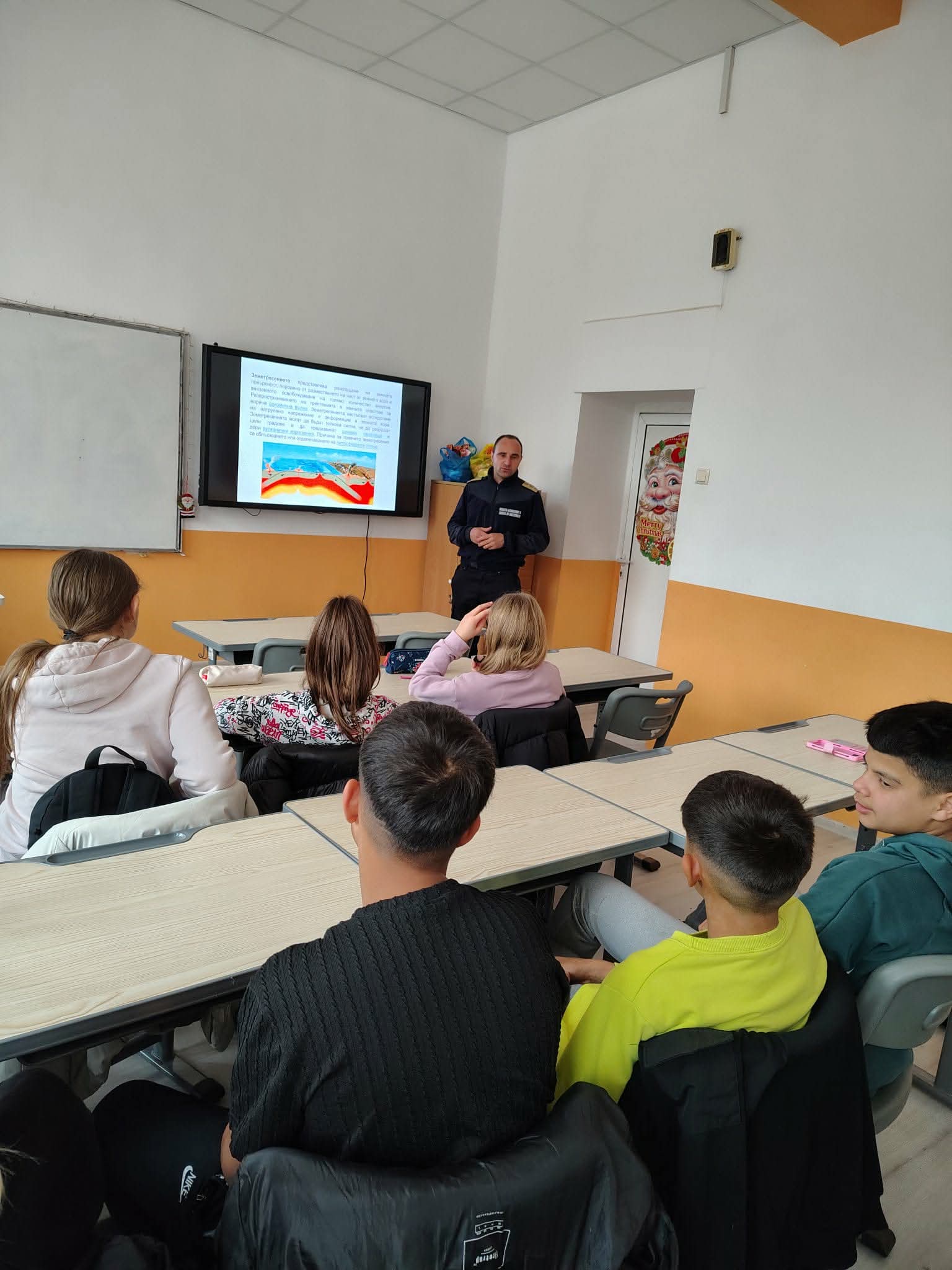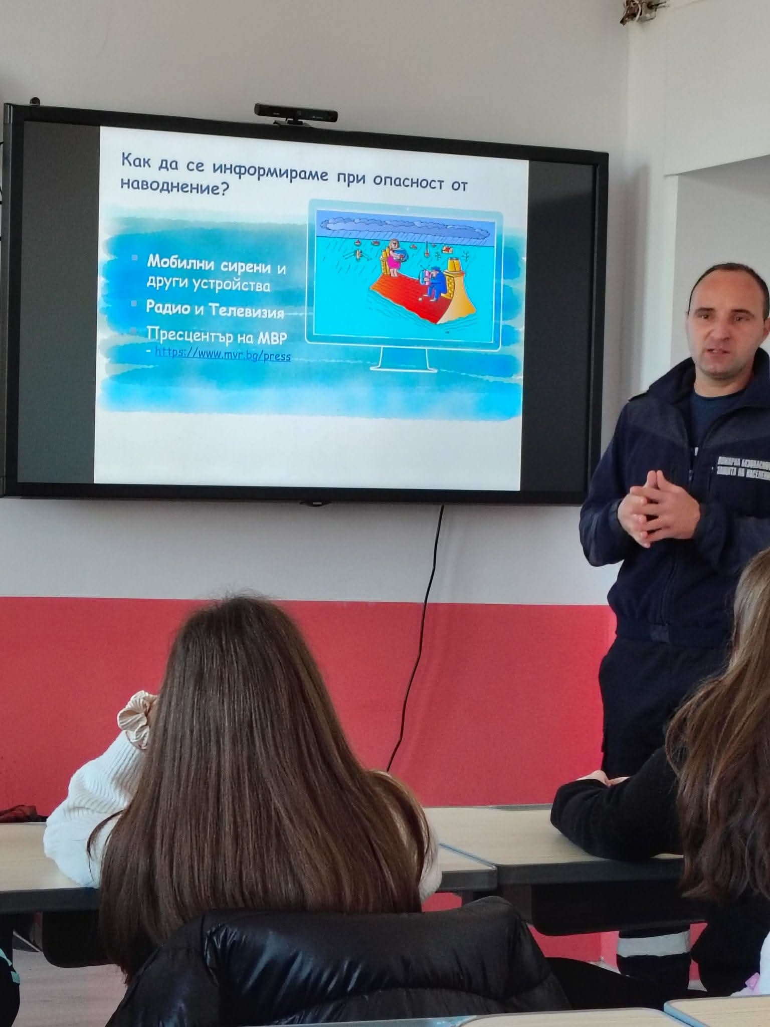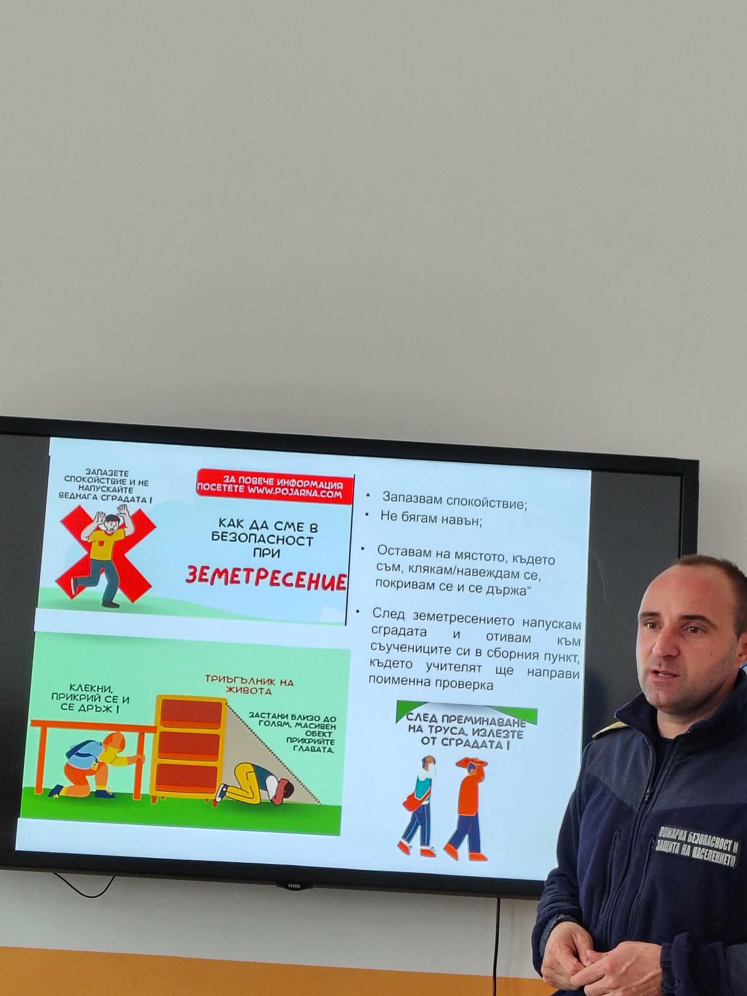 Втората част от обучението беше посветена на правилата за поведение при земетресение. В хода на беседата учениците се запознаха с основните причини за възникването на земетресения и разбраха колко важно е да запазят самообладание, като следват правилните стъпки за опазване на живота и здравето си.