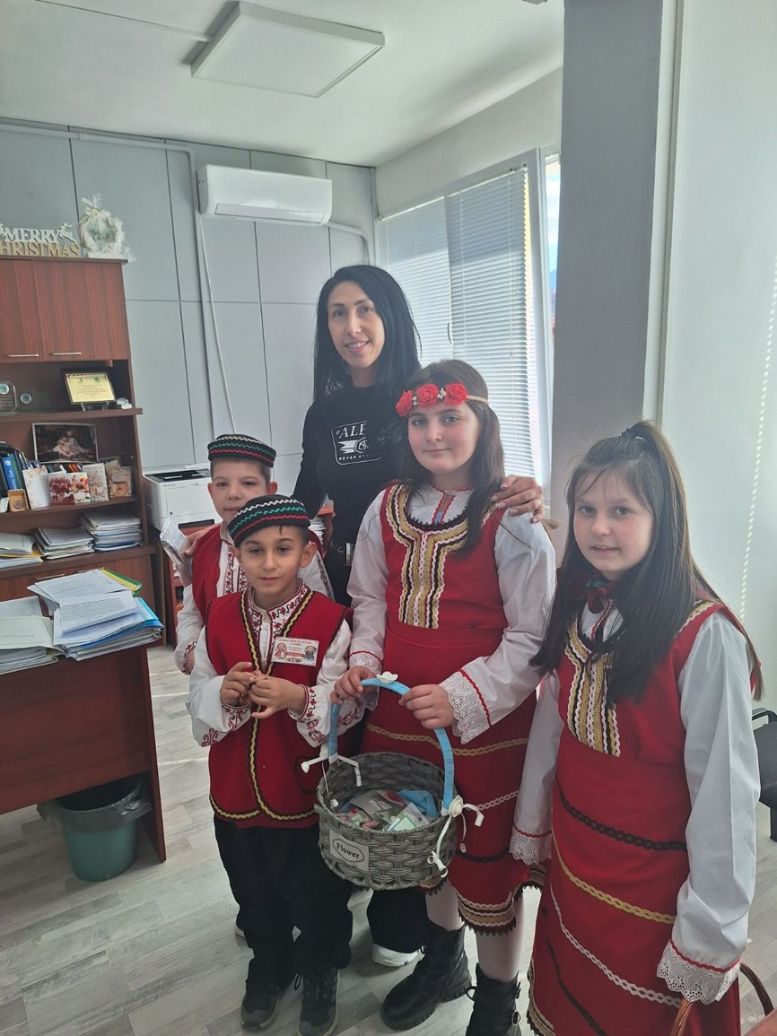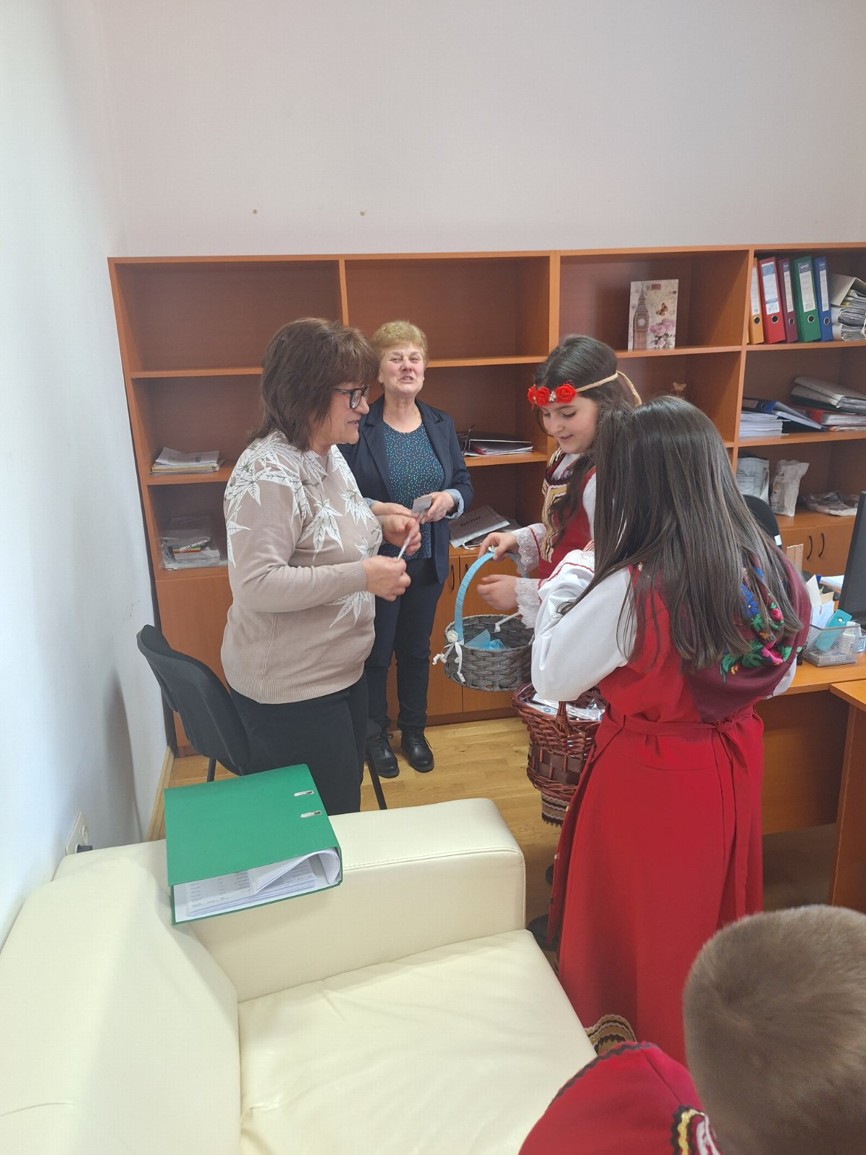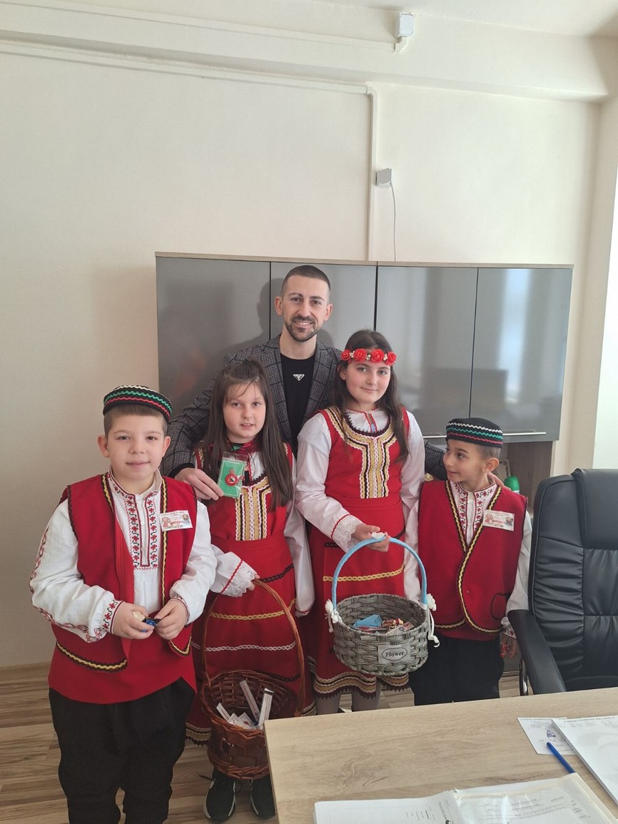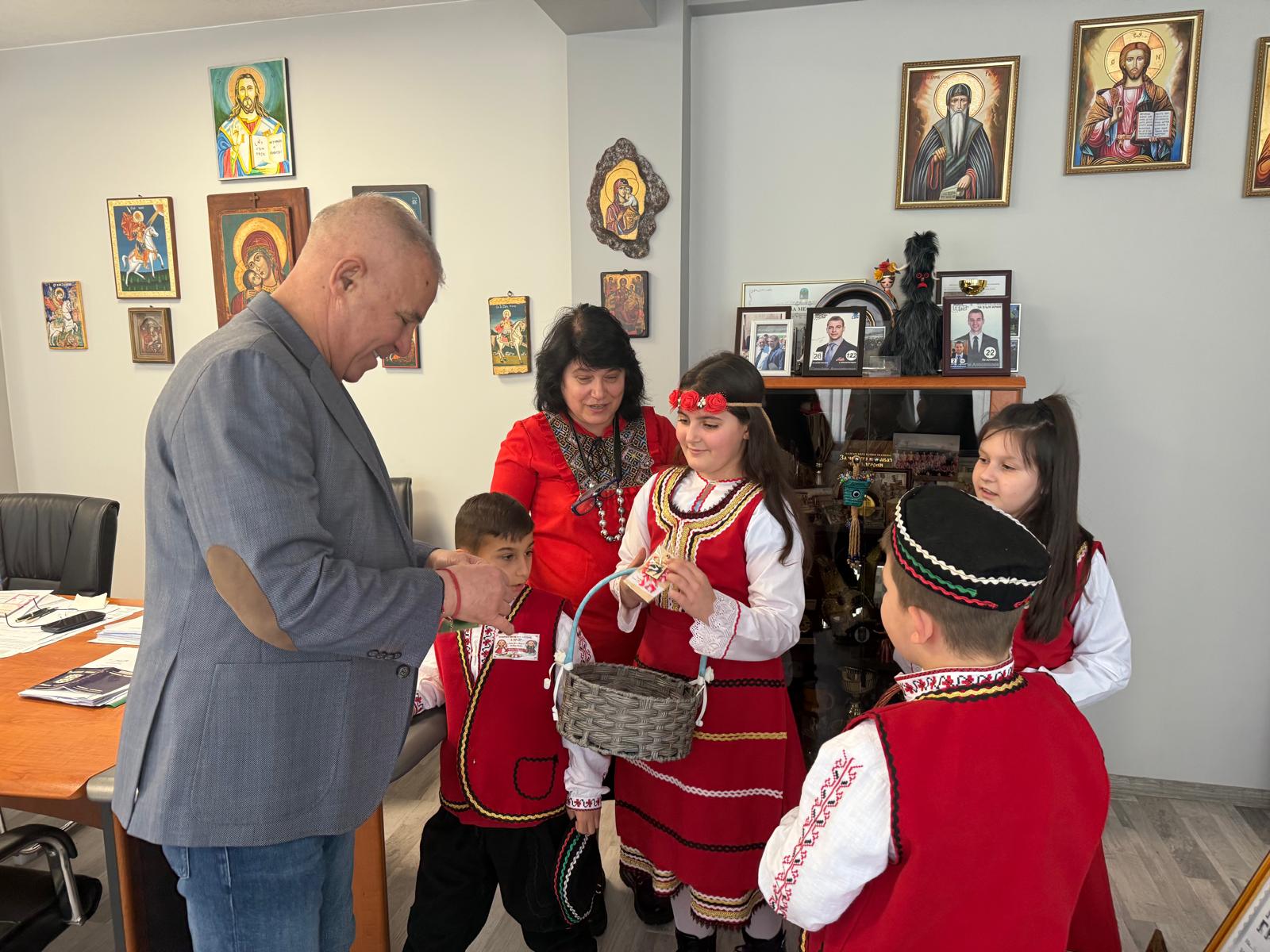 С много усмивки и вълнение учениците лично поднесоха на кмета на община Симитли г-н Апостол Апостолов мартеница – символ на здраве, сила и ново начало, с пожелание за благоденствие и успешна година.