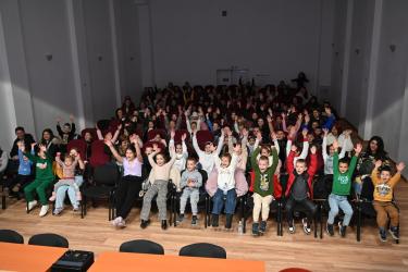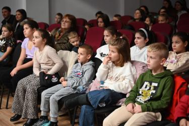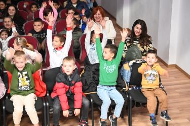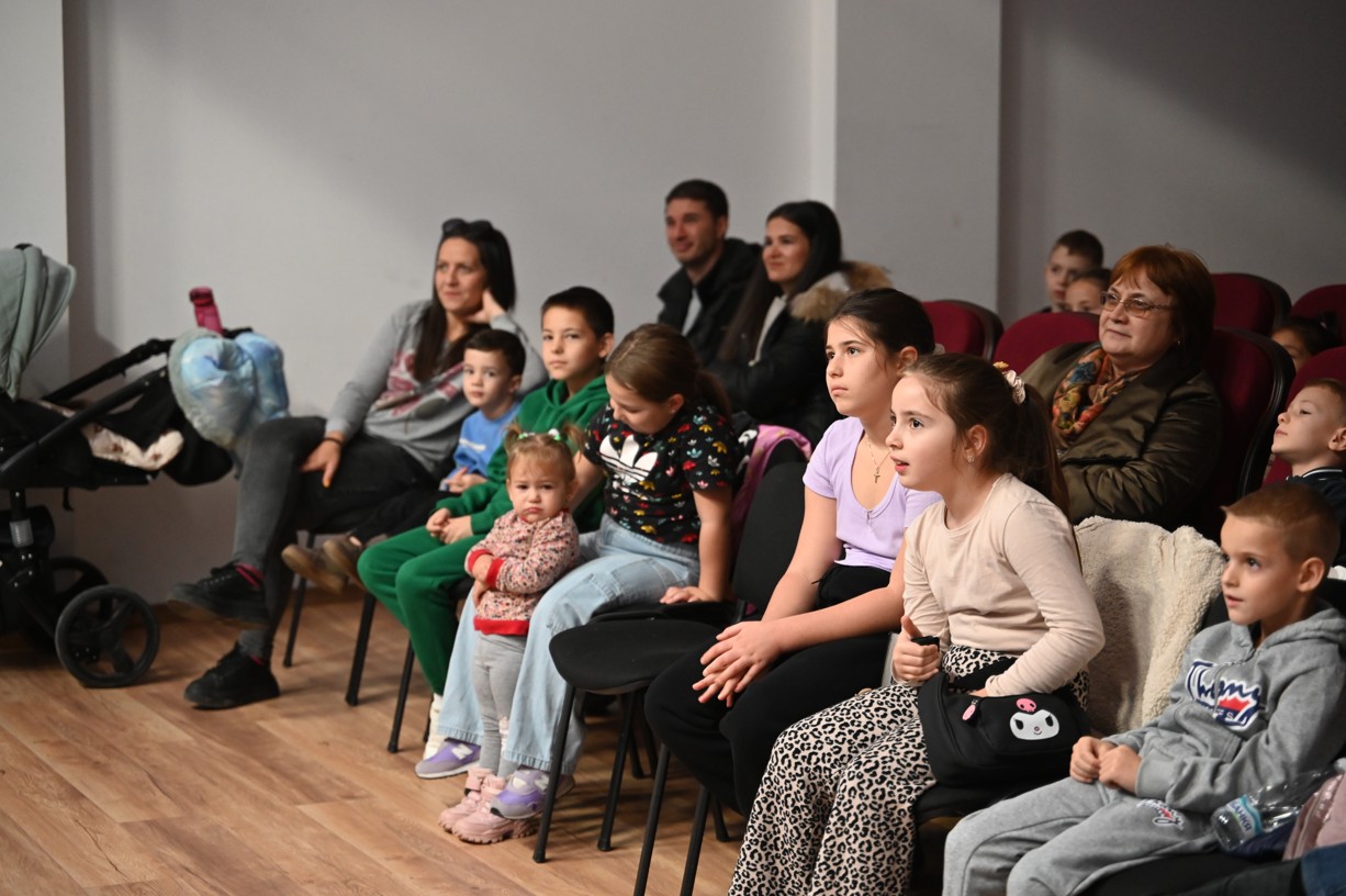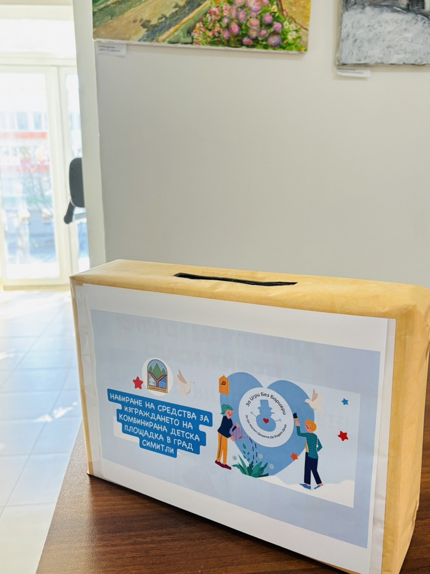 Финалът на детското представление завърши с важно съобщение: на изхода на читалището е поставена благотворителна кутия, в която се събират средства за инициативата на Община Симитли за изграждане на комбинирана детска площадка в града.